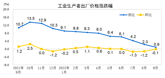 2022年9月份,全国工业生产者出厂价格同比上涨0.9%,环比下降0.1%;工业生产者购进价格同比上涨2.6%,环比下降0.5%。1—9月平均,工业生产者出厂价格比去年同期上涨5.9%,工业生产者购进价格上涨8.3%。